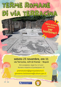 In occasione dell’apertura straordinaria delle Terme Romane sabato 23 novembre, dalle 11 alle 12, ci sarà una visita guidata gratuita per bambini e bambine, poiché il numero massimo di partecipanti è di 20 occorre prenotare scrivendo a giovanna.baldasarre@cultura.gov.it o prenotazioni@ganapoletano.it (Gruppo Archeologico Napoletano che si occuperà di organizzare il gruppo fino al raggiungimento del numero massimo di partecipanti).