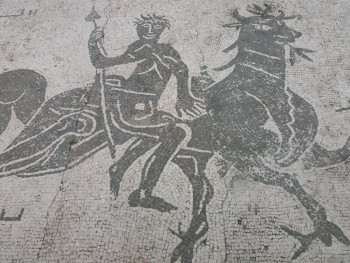 Mal conservata è anche la decorazione del pavimento formata da un mosaico a tessere bianche e nere raffigurante due delfini natanti ed un animale marino fantastico. L’illuminazione vi era assicurata dalle cinque finestre che si aprivano nella parete semicircolare. Lungo il perimetro dell’emiciclo corre, il canale di scolo delle acque, continuamente rifornito dalla cisterna attraverso condotti sotterranei, al di sopra del quale erano i sedili in pietra o marmo forati. Diversi erano i percorsi che gli utenti potevano scegliere a seconda delle preferenze o delle esigenze terapeutiche. Quello principale prevedeva varie soste in quattro ambienti riscaldati a varie temperature, quindi la permanenza nel calidarium absidato, con labrum per le abluzioni e la vasca per il bagno caldo, ed infine l’accesso mediante un vano di passaggio al frigidarium con due vasche per i bagni freddi ed un mosaico pavimentale a figure nere su fondo bianco raffigurante animali fantastici, cavalcati o seguiti da figure antropomorfe e delfini agli angoli. Il crollo parziale delle pavimentazioni e la caduta dei rivestimenti parietali hanno messo a nudo gli elementi strutturali connessi alla produzione del calore - i forni laterali - con vani di servizio e alla sua diffusione - le intercapedini al di sotto dei pavimenti e lungo le pareti. Tali ambienti, secondo lo schema noto da Vitruvio, risultano orientati a Sud-Ovest, in modo da poter meglio sfruttare il calore e la luce del sole durante le ore pomeridiane.