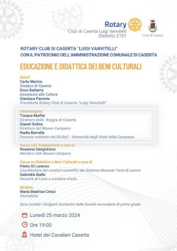 Il Rotary Club di Caserta “Luigi Vanvitelli” intende farsi promotore di una circostanza di studio e riflessione sulle prospettive delle strategie educative dei beni culturali e sullo stato del tessuto relazionale che connette realtà museali del territorio in ordine alla fruizione da parte di un’utenza afferente alla scuola secondaria di primo e secondo grado.