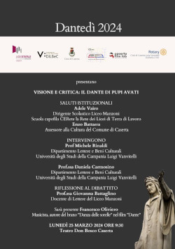 Sempre il 25 marzo il Rotary Club Caserta Luigi Vanvitelli promuove anche un altro importante evento culturale, in sinergia con il Liceo Statale Manzoni di Caserta, il DiLBeC, la Città di Caserta, CERete e Caserta Film Lab: il Dantedì 2024. La manifestazione dal titolo: “Visione e critica: Il Dante di Pupi Avati”, che avrà luogo al Teatro Don Bosco di Caserta, sarà aperta dai saluti istituzionale da parte della dirigente scolastica del Manzoni, Scuola capofila CERete, la Rete dei Licei di Terra di Lavoro, Adele Vairo e dell’assessore comunale alla cultura Battarra. Interverranno i professori Michele Rinaldi e Daniela Carmosino del Dipartimento Lettere e Beni Culturali dell’Università Vanvitelli. Seguirà una riflessione al dibattito con Giovanna Battaglino, docente di lettere del Liceo Manzoni. Sarà presente Francesco Oliviero, musicista, autore del brano “Danza delle sorelle” nel film “Dante” di Pupi Avati. L’evento avrà inizio alle 9.30.